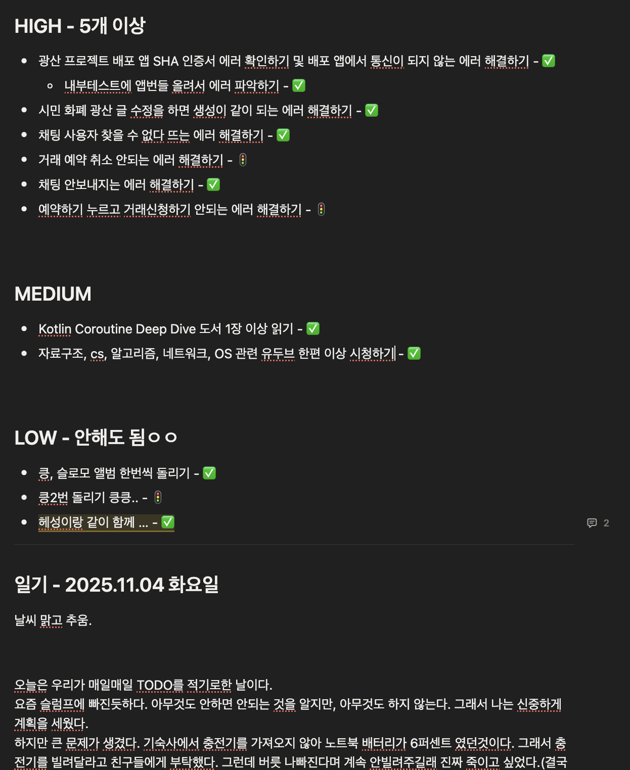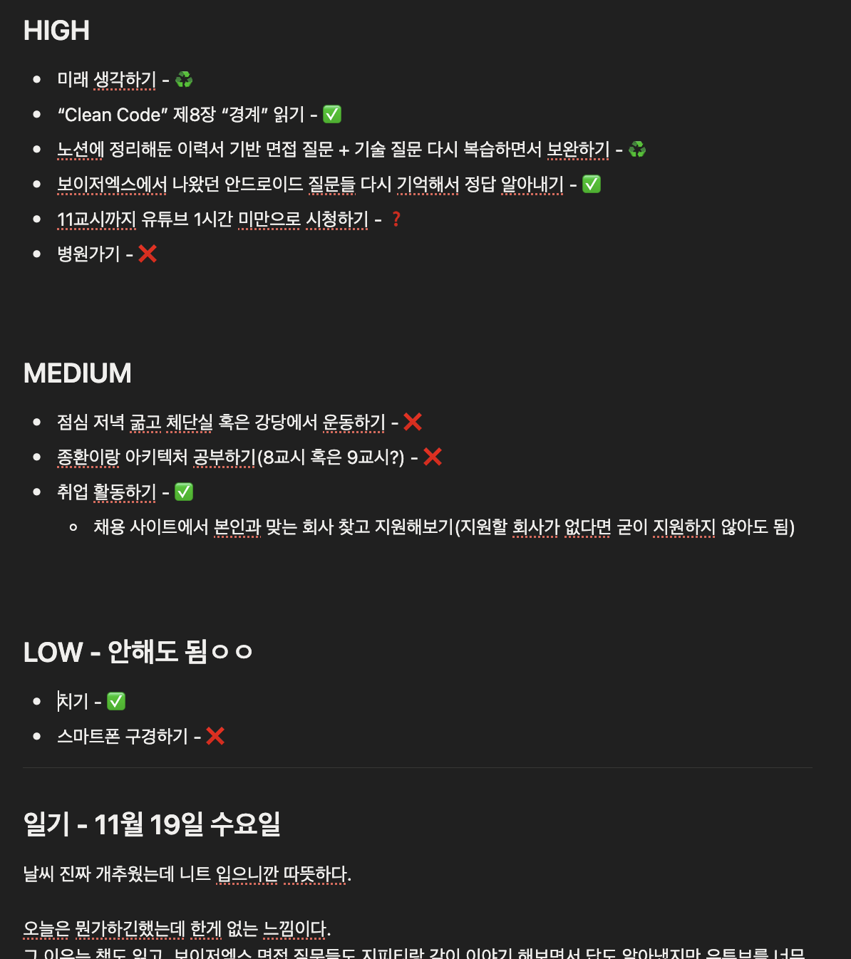 그래서 졸업식 때까지 빨간 날 주말 하루도 빠지지 않고 todo 작성과 일기를 쓰며 최소한의 루틴을 만들어가려 노력했다.처음부터 목표를 크게 잡으면 빨리 무너지기 마련이다.